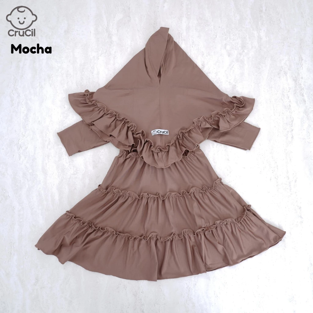 * jilbab menggunakan soft pet, bisa tegak dibagian ujung dahi. jahitan rample luar dengan pinggiran kril/nechi melingkar sampai belakang.